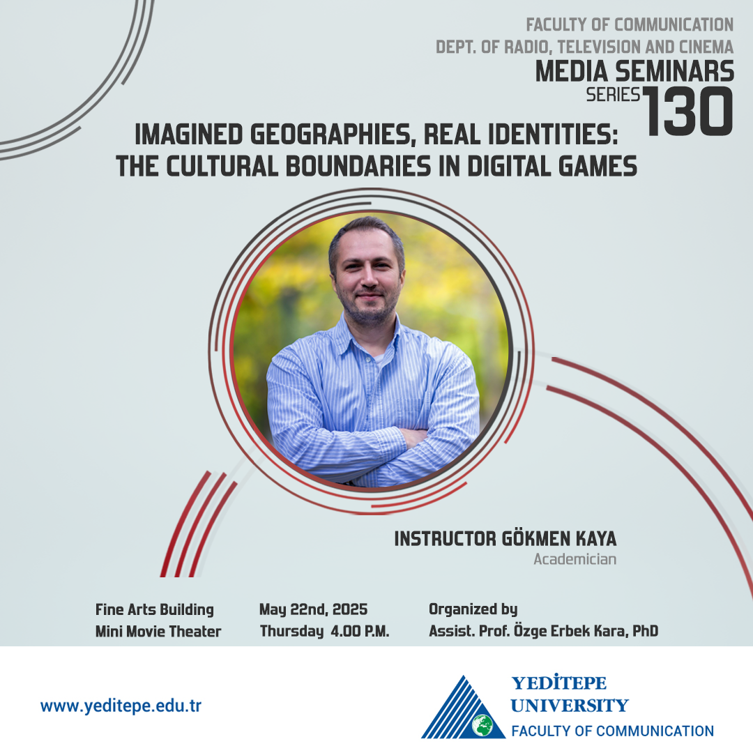The 130th session of the Media Seminars Series, organized as part of the RTC 482 Media Seminars course by the Department of Radio, Television, and Cinema at Yeditepe University’s Faculty of Communication since 2015, is taking place this week. The seminar, titled “Imagined Geographies, Real Identities: The Cultural Boundaries in Digital Games”, is organized by Assist. Prof. Özge Erbek Kara, PhD and will feature Academician Instructor Gökmen Kaya as the guest speaker.