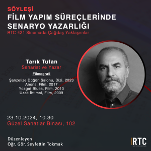 Lecturer Assist. Screenwriter - Author Tarık Tufan will be the guest of the conversation titled "Screenwriting in Film Production Processes" organized by Seyfettin Tokmak within the scope of RTC 421 Contemporary Approaches in Cinema course.
