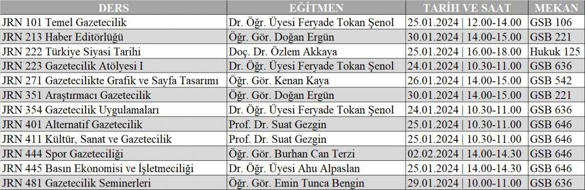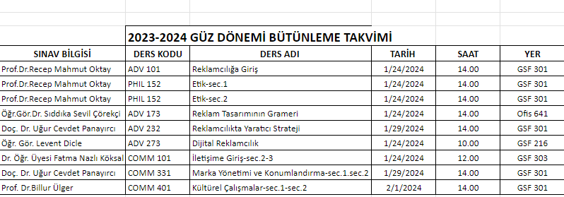 2023-2024 Akademik Yılı Güz Dönemi Bütünleme Sınav Takvimi aşağıdaki gibidir.