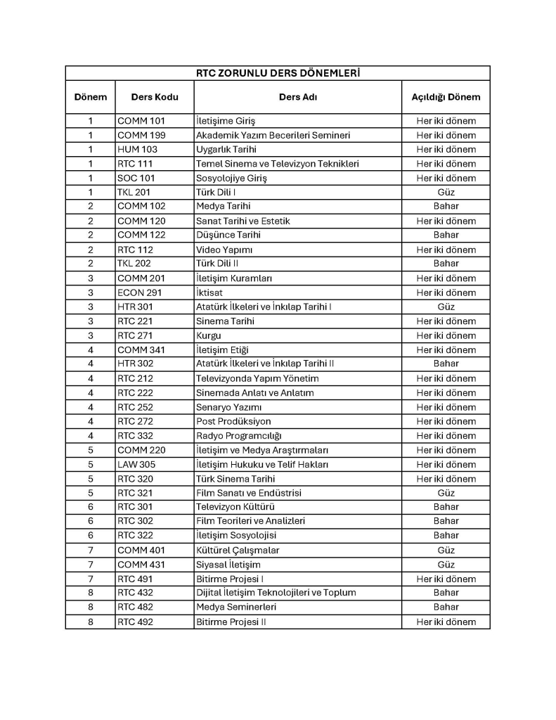 Radyo, Televizyon ve Sinema Bölümü zorunlu ders dönemlerine ilişkin tabloya erişmek için tıklayınız.