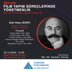 Öğr. Gör. Seyfettin Tokmak tarafından RTC 421 Sinemada Çağdaş Yaklaşımlar dersi kapsamında gerçekleştirilen "Film Yapım Süreçlerinde Yönetmenlik" başlıklı söyleşiye Yapımcı, Yönetmen, Senarist ve Oyuncu Ezel Akay konuk oluyor.