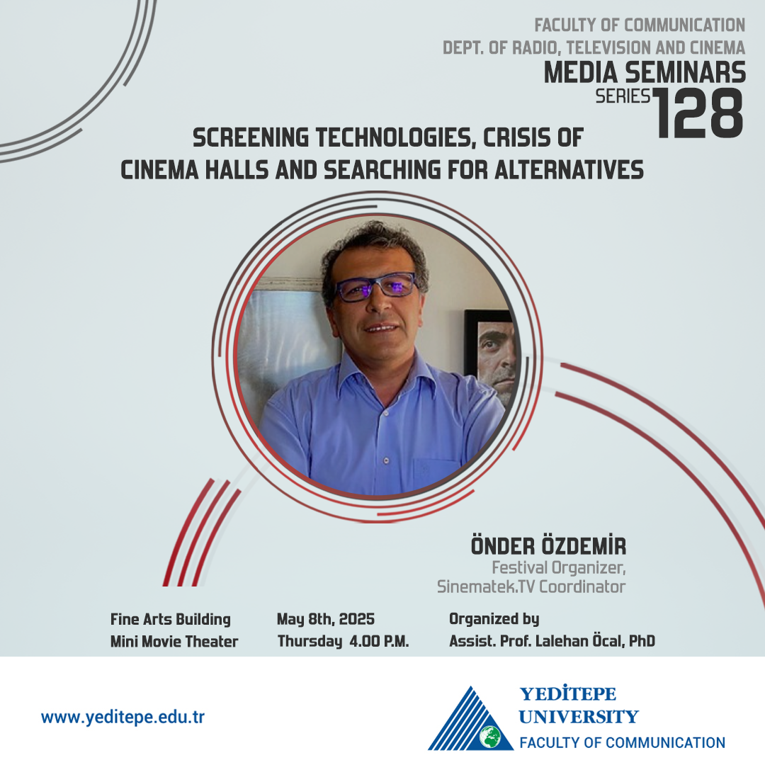 Yeditepe Üniversitesi İletişim Fakültesi Radyo, Televizyon ve Sinema Bölümü tarafından 2015 yılından bu yana RTC 482 Medya Seminerleri dersi kapsamında gerçekleştirilen seminerler dizisinin bu hafta 128.si yapılıyor. Dr. Öğr. Üyesi Lalehan Öcal tarafından düzenlenen “Sinema Teknolojileri, Sinema Salonlarının Krizi ve Alternatif Arayışlar” konulu seminere, Festival Düzenleyicisi ve Sinematek.TV Koordinatörü Önder Özdemir konuk oluyor.