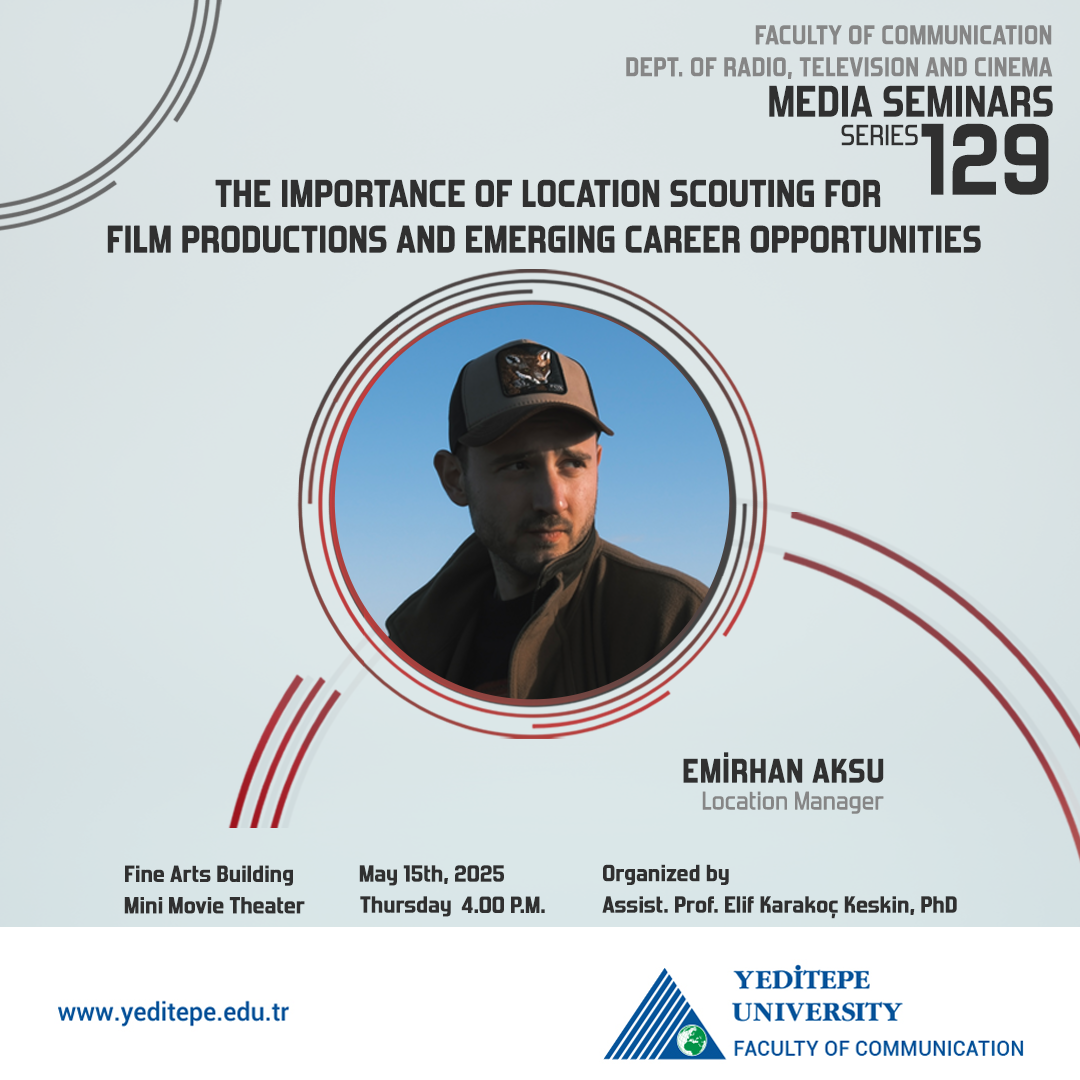 Yeditepe Üniversitesi İletişim Fakültesi Radyo, Televizyon ve Sinema Bölümü tarafından 2015 yılından bu yana RTC 482 Medya Seminerleri dersi kapsamında gerçekleştirilen seminerler dizisinin bu hafta 129.su yapılıyor. Dr. Öğr. Üyesi Elif Karakoç Keskin tarafından düzenlenen “Film Prodüksiyonları için Mekân Seçiminin Önemi ve Yeni Kariyer Fırsatları” konulu seminere, Mekân Sorumlusu Emirhan Aksu konuk oluyor.